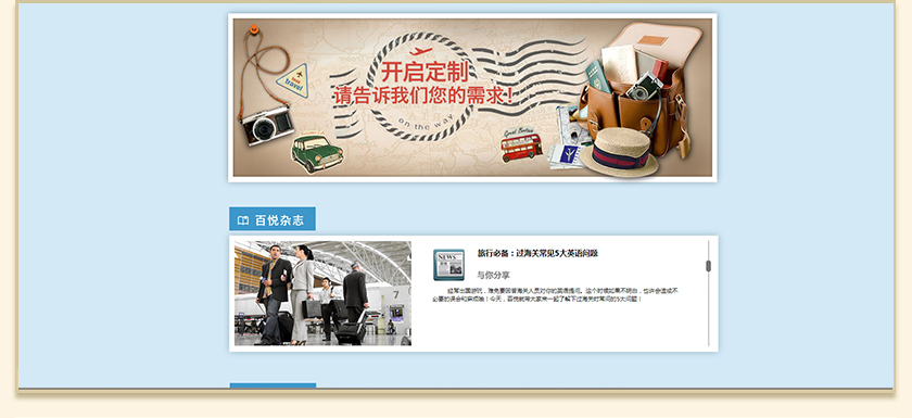 Project Description 百悦逸游于2012年初由二位资深的旅行家创办,是成都传媒集团旗下成都新闻国际旅行社有限公司的高端旅游品牌,总部位于成都高新区天府大道中段美年广场。在百悦逸游成立之前,创始团队亲自到全球三十多个国家实地考察,带着第一手的资讯和执着的信念创立了中国西部第一家真正意义上的私人定制旅行机构。百悦的旅行不是跟团挤大巴,不是十天去十个国家,更不是没完没了的... Official website address 晋城http://www.100.travel I want to share